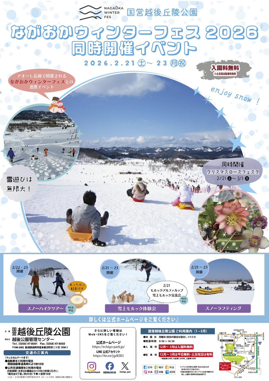 また、越後丘陵公園では、21日から23日の間、スノーラフティングや雪上モックルなどウィンタースポーツが楽しめますよ♪
