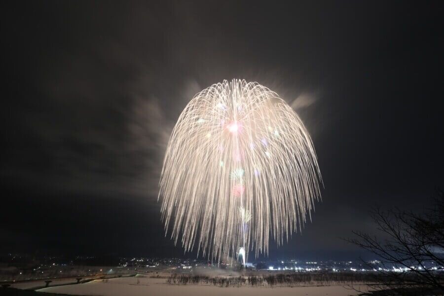 冬の夜空を虹色に彩る花火の光が、地上の雪にキラキラと映る光景は、冬の思い出に残ること間違いなしです♪