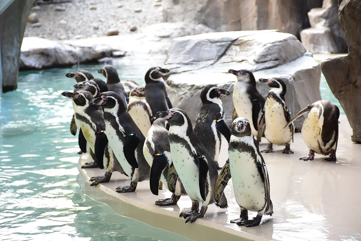 ペンギン海岸では、絶滅の恐れがあるフンボルトペンギンを約90羽飼育・展示しています。フンボルトペンギンの生態や体のつくり、生息環境など解説してくれる「ペンギン解説」も聞きごたえ抜群です。