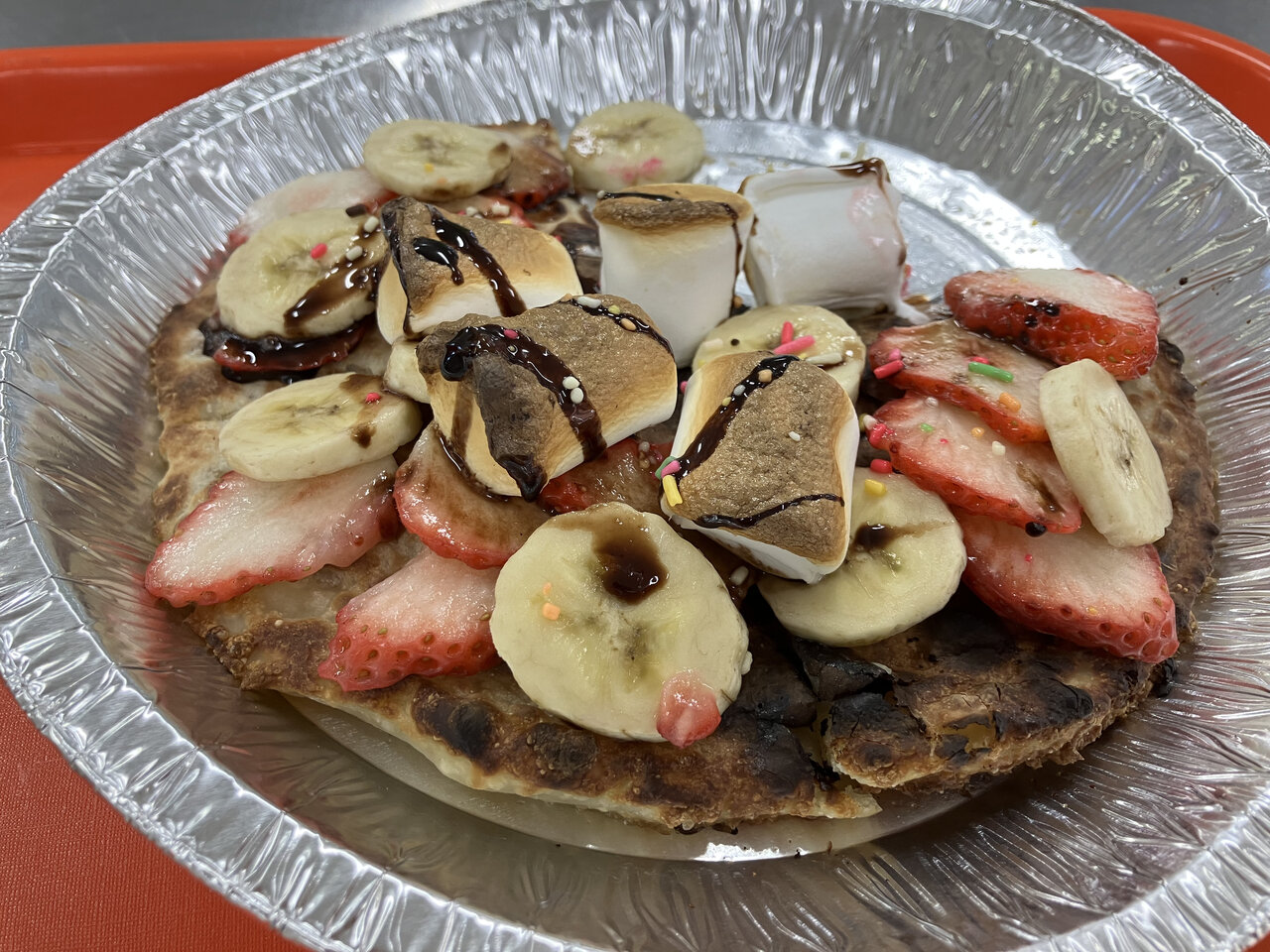 生地が焼きあがったところで、思うままに越後姫・バナナ・マシュマロをのせました!