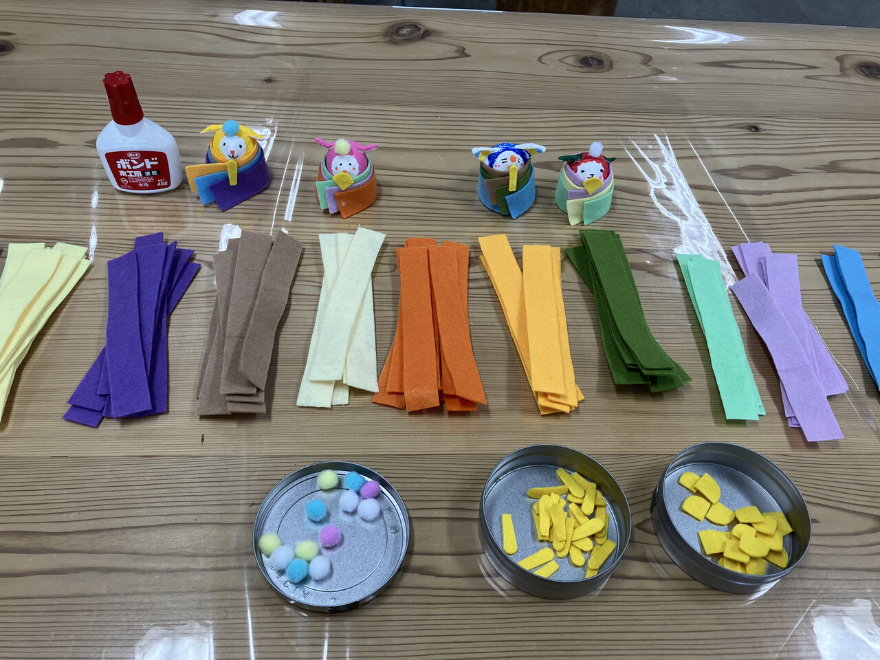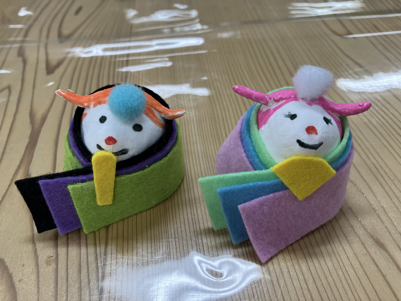 色を塗って顔を描き、好きな色のフェルトを3枚組み合わせて巻き付ければ、オリジナルひな人形の完成!