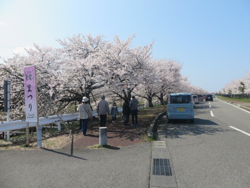 すぐ近くの能代川の河川敷にある遊歩道もオススメのお花見スポット。