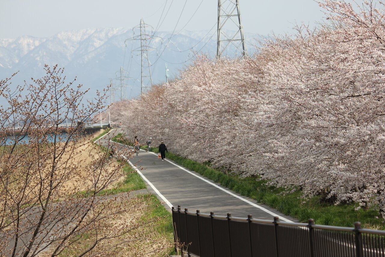 すぐ近くの能代川の河川敷にある遊歩道もオススメのお花見スポット。