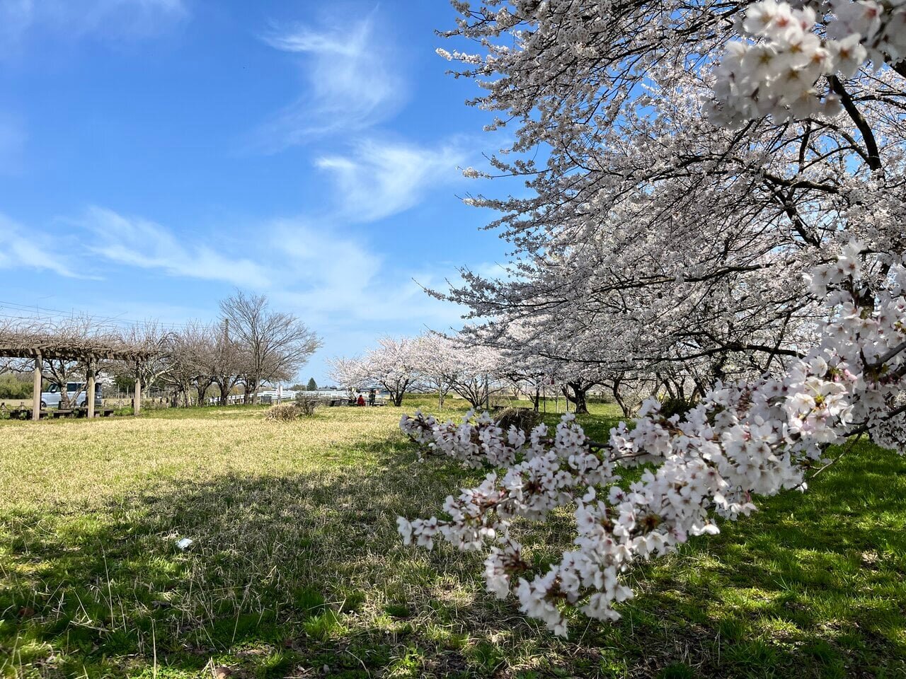 桜並木の下を散歩するも良し、芝生の上でゆったりお花見をするのも良しです。