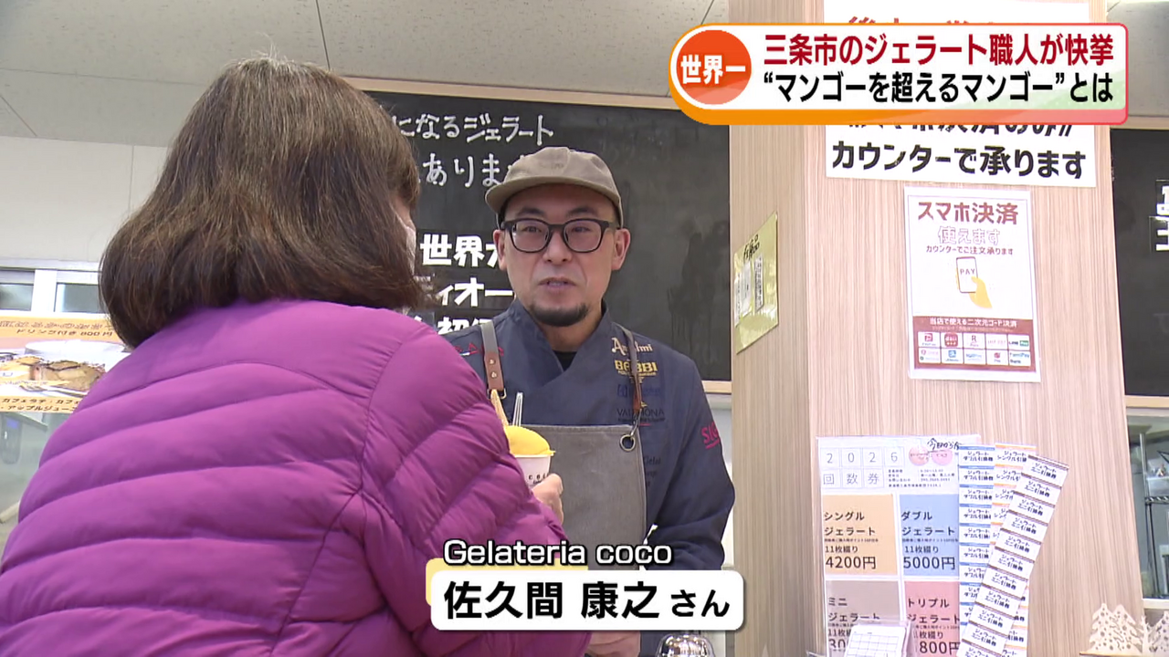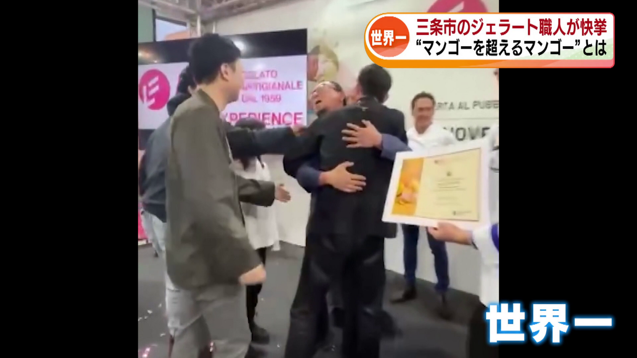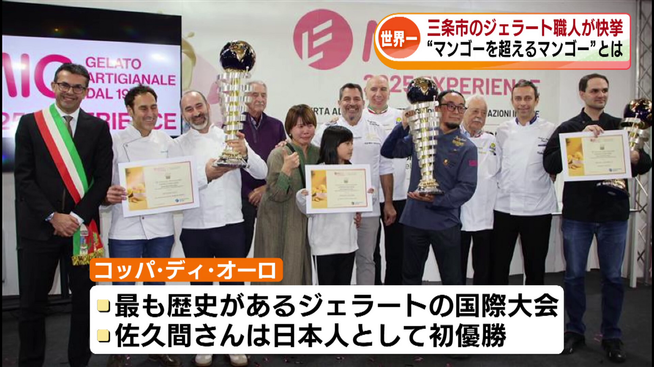 小さなジェラート店が世界一に輝きました。三条市のジェラート職人が国際大会で日本初となる優勝を果たしました。日本人・初の快挙に三条市で祝賀会が開かれ、世界一に輝いた佐久間康之さんに花束が贈られました。