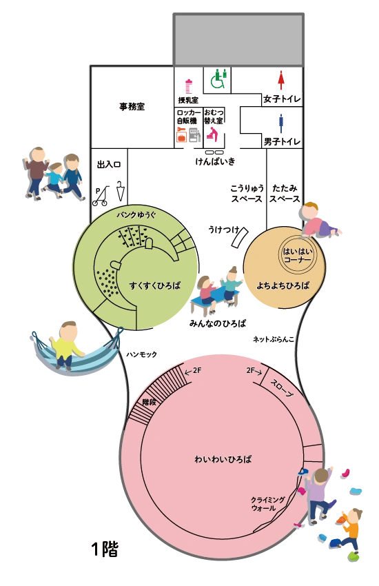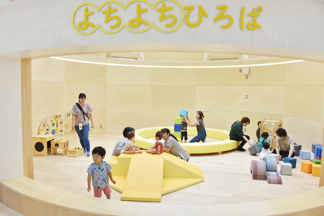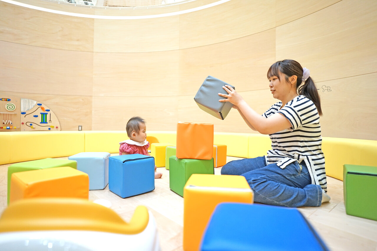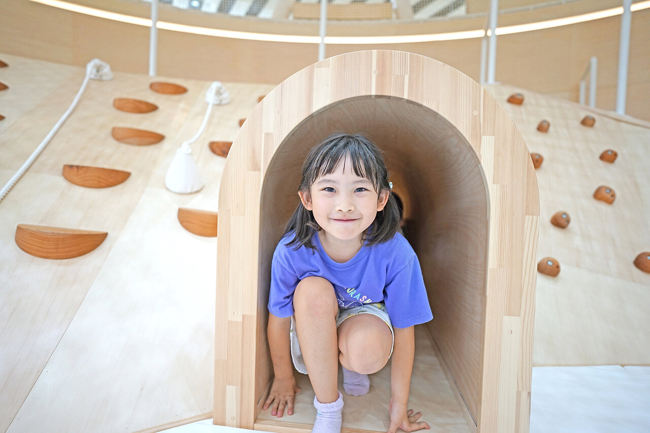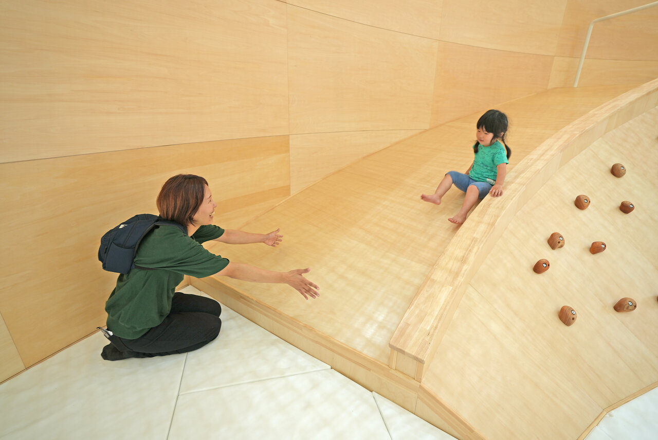 このスペースでは、広々としたすべり台やロープのぼりなどがあり、こどもに寄り添いながら遊ぶことができますよ!