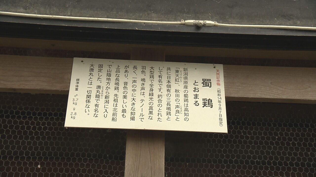 実は蜀鶏、高知県の「東天紅(とうてんこう)」、秋田県の「声良(こえよし)」とともに、日本の三大長鳴鶏(ながなきけい)の一種なんです!